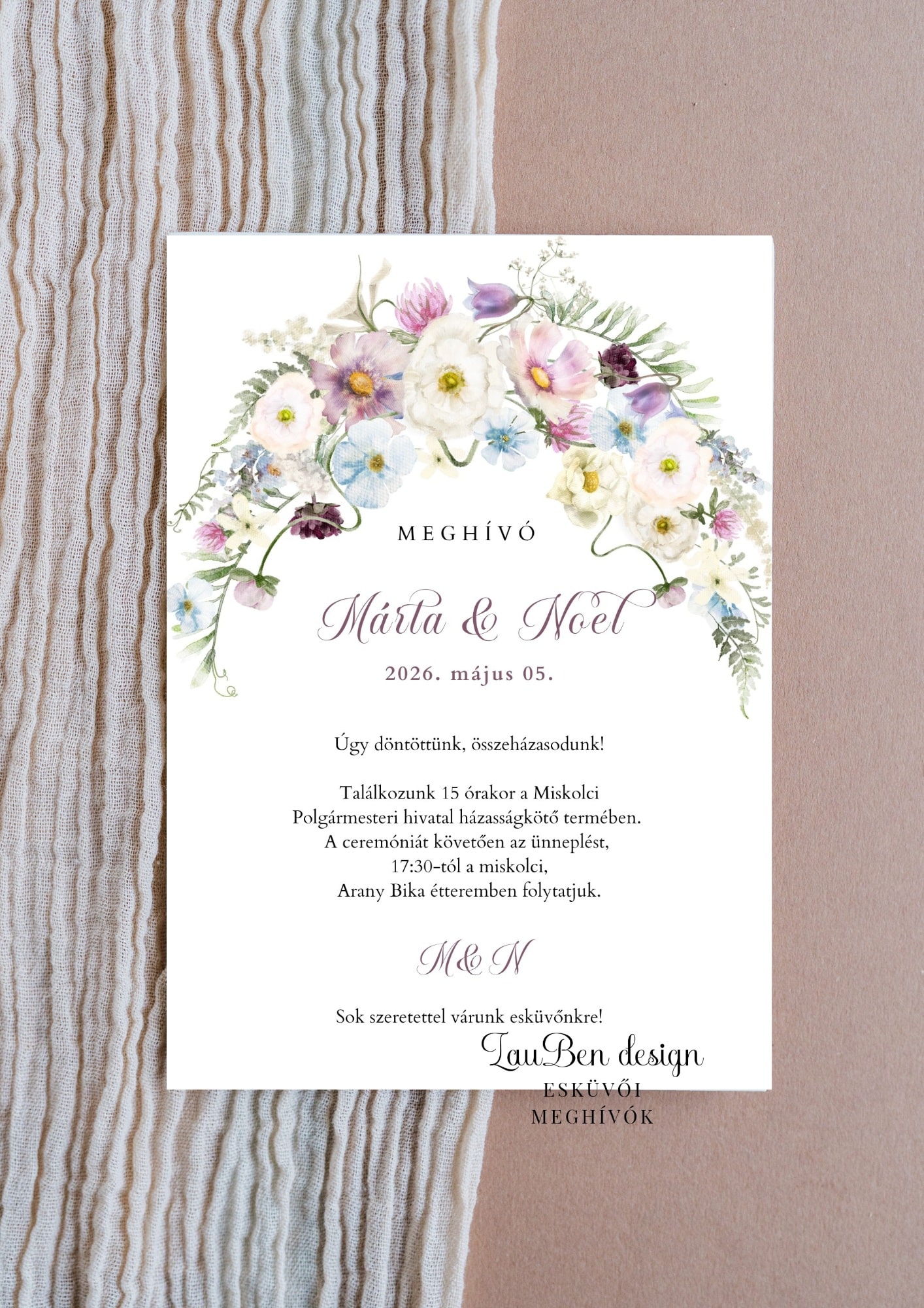 Ez a meghívó a kifinomult nőiesség és a tavaszi zsongás találkozása. A félköríves, lágy akvarell virágkoszorú nemcsak keretbe foglalja a nagy napotok részleteit, de egyfajta természetes kapuként is szolgál, amelyen át beléphetünk a közös történetetekbe. A púderrózsaszín, a halvány mályva és a tiszta fehér szirmok harmóniája a gyengédséget és az örök hűséget szimbolizálja.
