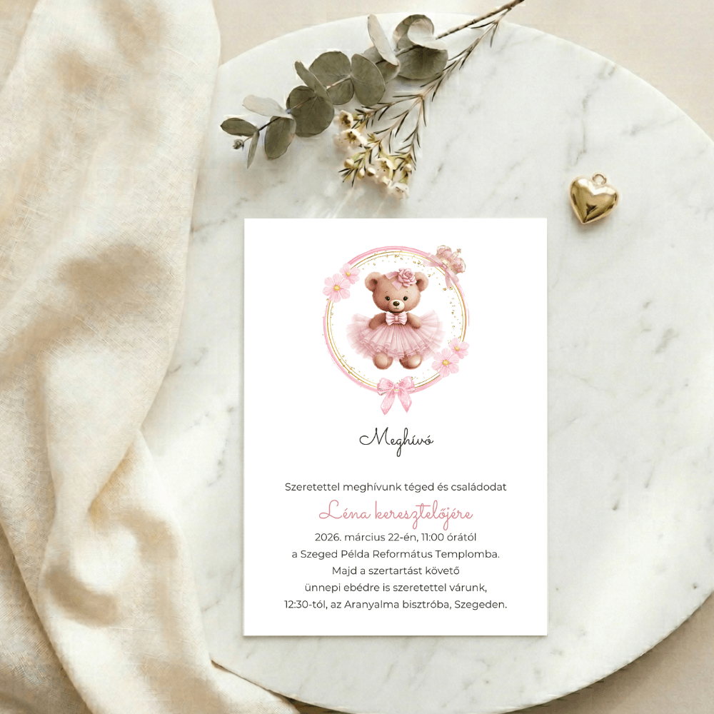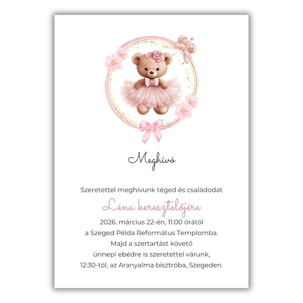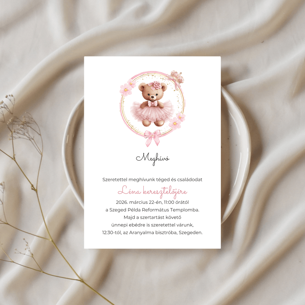 A selymes rózsaszín tütüt viselő kismaci és a lágy virágkoszorú a kislányos báj és elegancia tökéletes ötvözete. Legyen szó keresztelőről, az első születésnapról, babaváró buliról vagy névadó ünnepségről, ez a mesebeli grafika minden fontos pillanatot ragyogóvá varázsol.