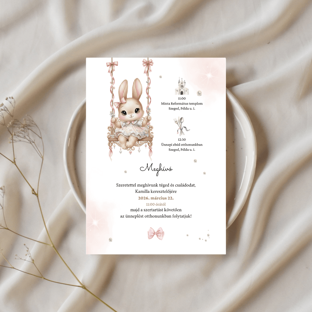 A kedves, rózsaszín masnis nyuszi figurája és a körülötte tündöklő virágos hinta motívuma mesebeli, mégis rendkívül elegáns keretet adnak a meghívásnak. Ez a letisztult, prémium megjelenésű design tökéletes választás, ha egy igazán szívhez szóló és maradandó emléket szeretnétek adni a családtagoknak és barátoknak.