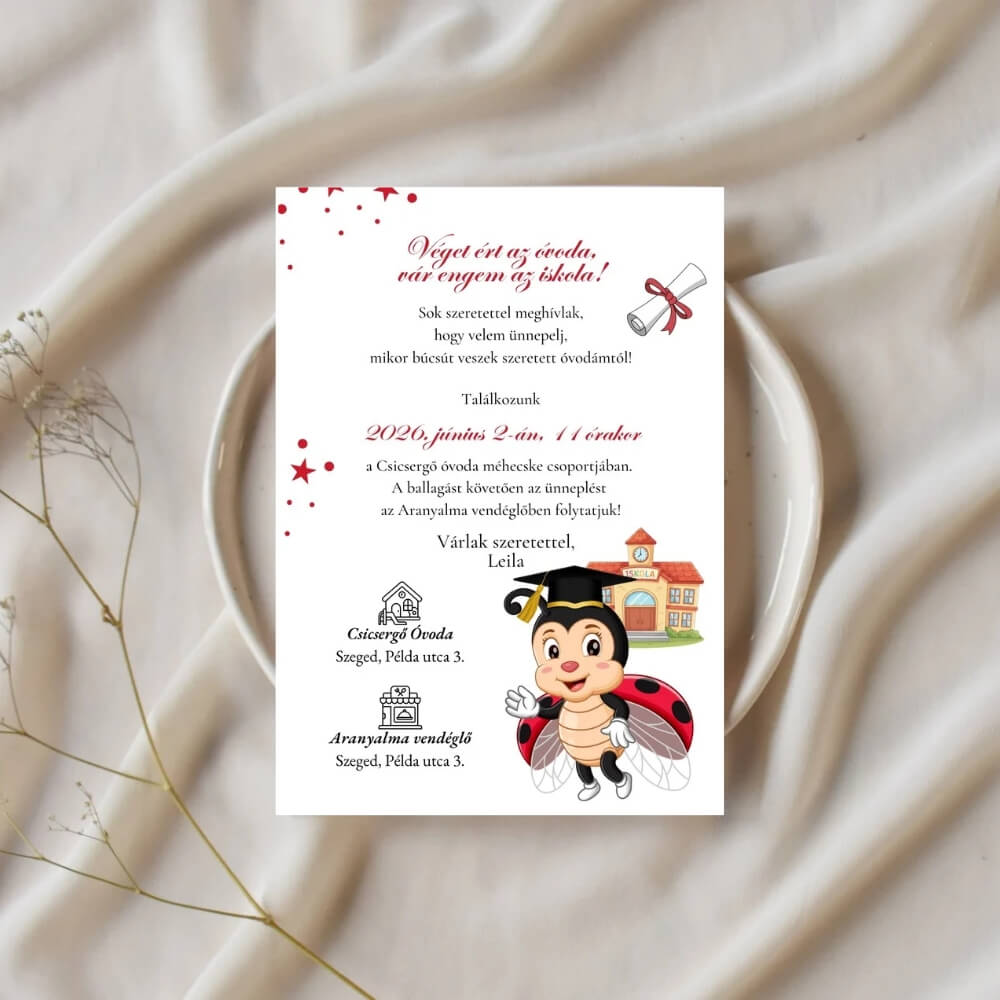 „Véget ért az óvoda, vár engem az iskola!” – Búcsú az óvodától, irány az iskola! Ez a tündéri, katicás illusztrációval díszített meghívó tökéletes választás, ha szeretnétek stílusosan és vidáman hírül adni gyermeketek első nagy mérföldkövét. A Lauben Design katicás meghívója nemcsak egy értesítő, hanem egy kedves emlék is, amely évek múlva is mosolyt csal majd a nagyszülők és rokonok arcára.