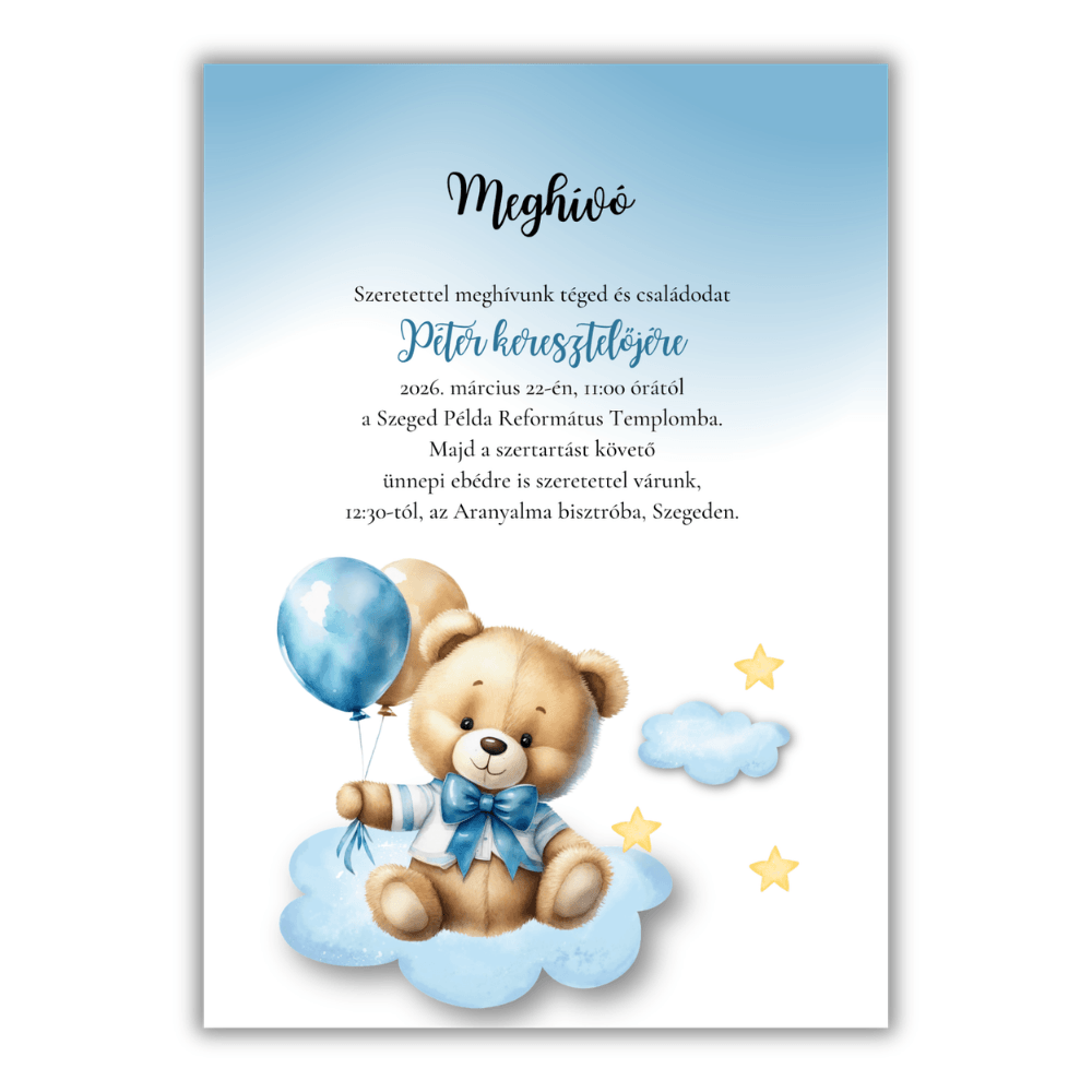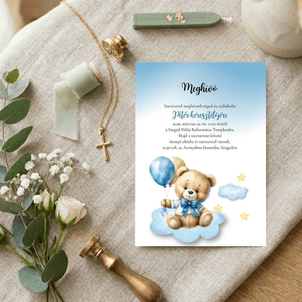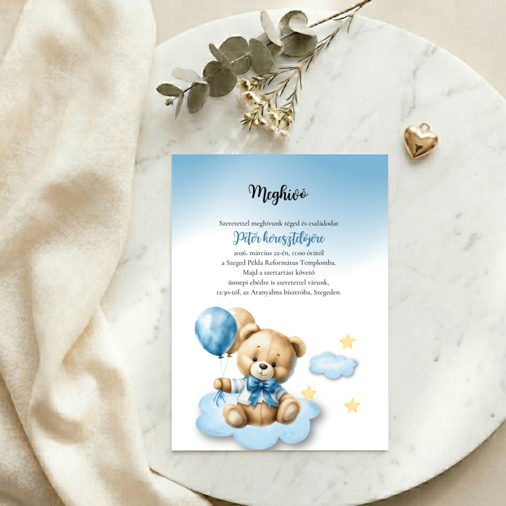 A kedves mackó figurája és a kezében tartott kék és ezüst lufi motívumok mesebeli, mégis rendkívül elegáns keretet adnak a meghívásnak. Ez a letisztult, prémium megjelenésű design tökéletes választás, ha egy igazán szívhez szóló és maradandó emléket szeretnétek adni a családtagoknak és barátoknak.