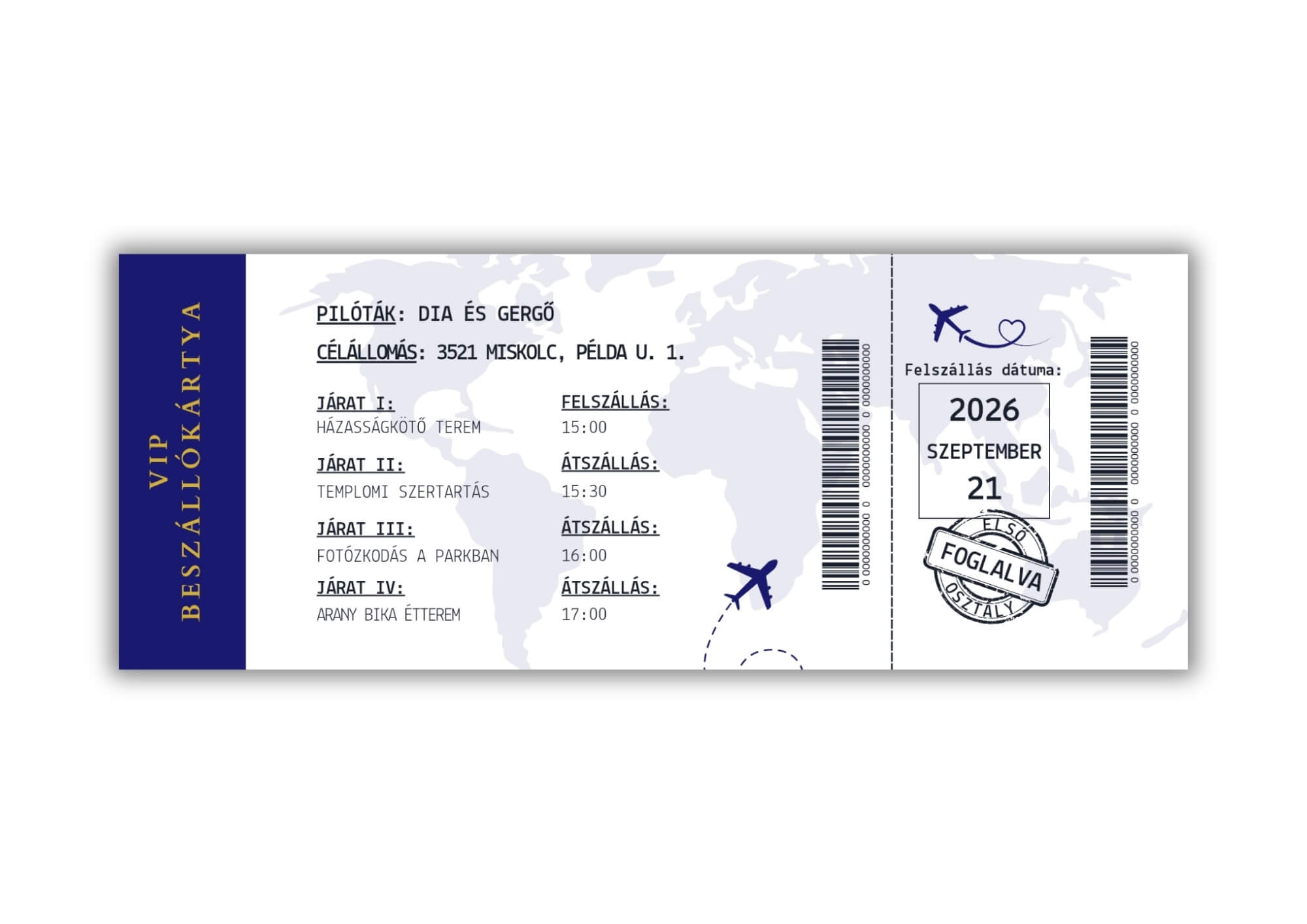 Boríték választása: A beszállókártya egyedi mérete miatt ehhez a meghívóhoz az LA/4-es méretű borítékot javasoljuk a tökéletes illeszkedés érdekében.