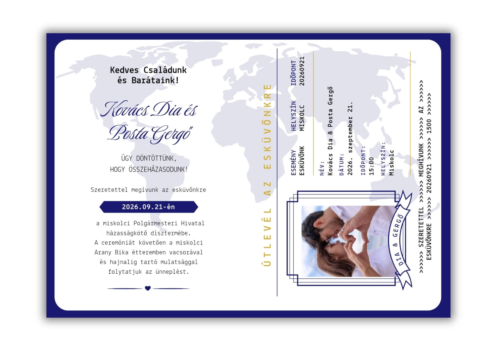 Készüljetek életetek legnagyobb utazására egy olyan meghívóval, amely már az első pillanatban a nagy napotok hangulatába repíti a násznépet! Útlevél stílusú kollekciónkat számos magával ragadó árnyalatban álmodtuk meg, hogy minden pár megtalálja a stílusához illő színvilágot. Fontos információ a megjelenéssel kapcsolatban: a meghívókon látható elegáns hatást prémium digitális nyomtatással érjük el, így a grafika nem tartalmaz valódi aranyozott réteget, ezüstözést vagy dombornyomott felületkezelést. A látványt a magas minőségű grafikai kidolgozás adja, amely papíron és fotókon is esztétikusan mutat.