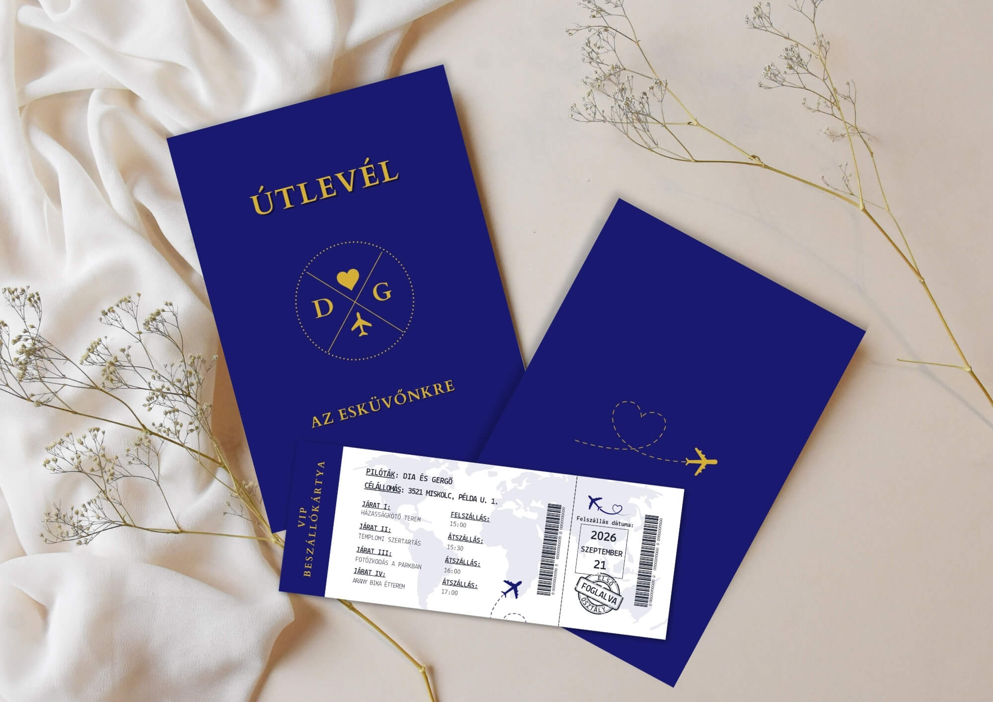 A Lauben Design hitvallása, hogy az ünnep a részletekben rejlik. Ez a különleges, beszállókártyával kiegészített darab nem csupán egy információközlő lap, hanem egy stílusos emlékőrző, amelyet vendégeitek évek múltán is féltve őriznek majd a közös kalandotok emlékeként.