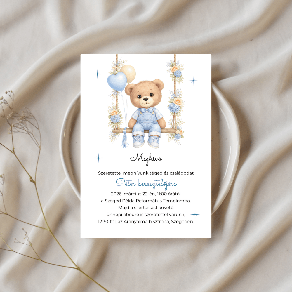 Keresztelő meghívó kisfiúknak hintázós mackóval