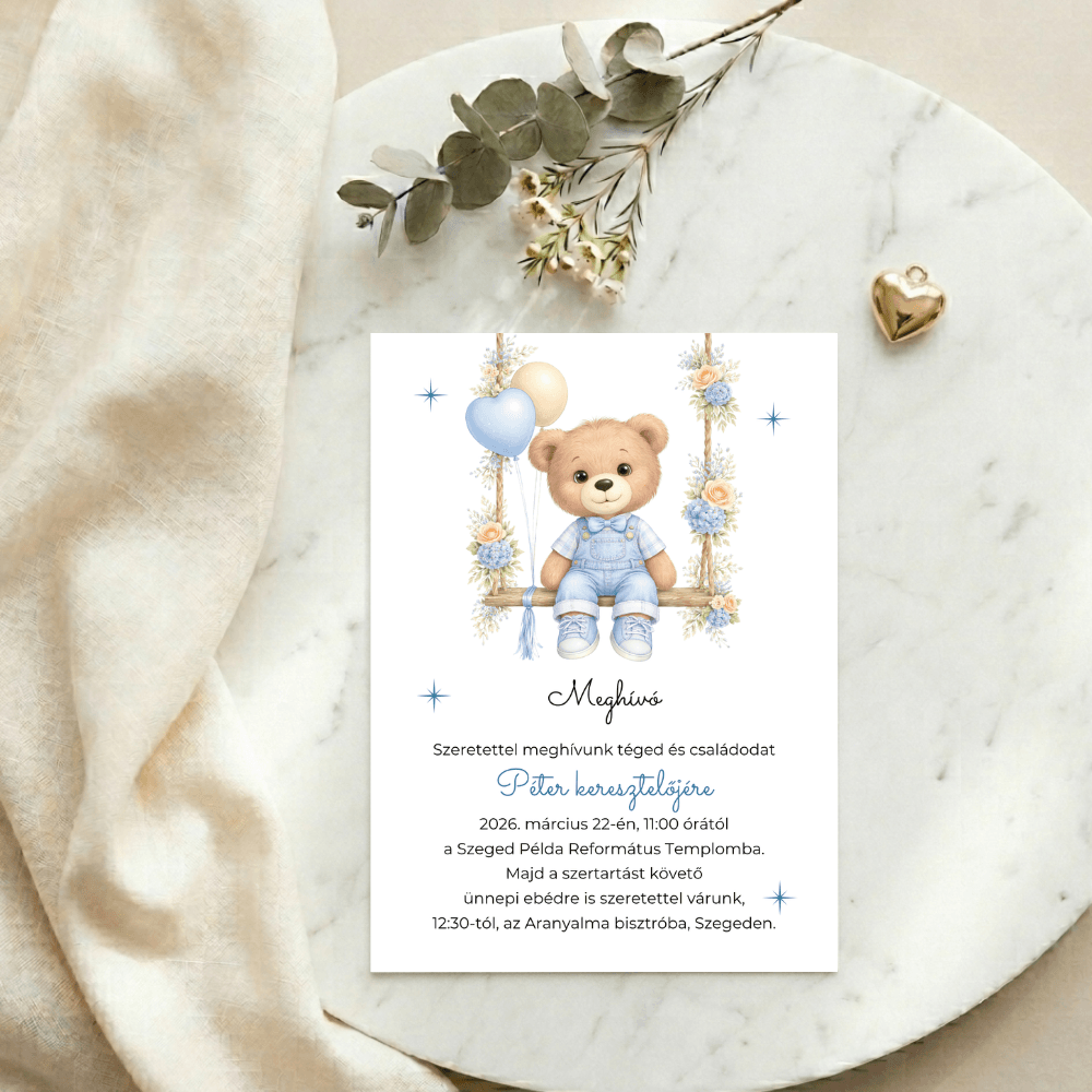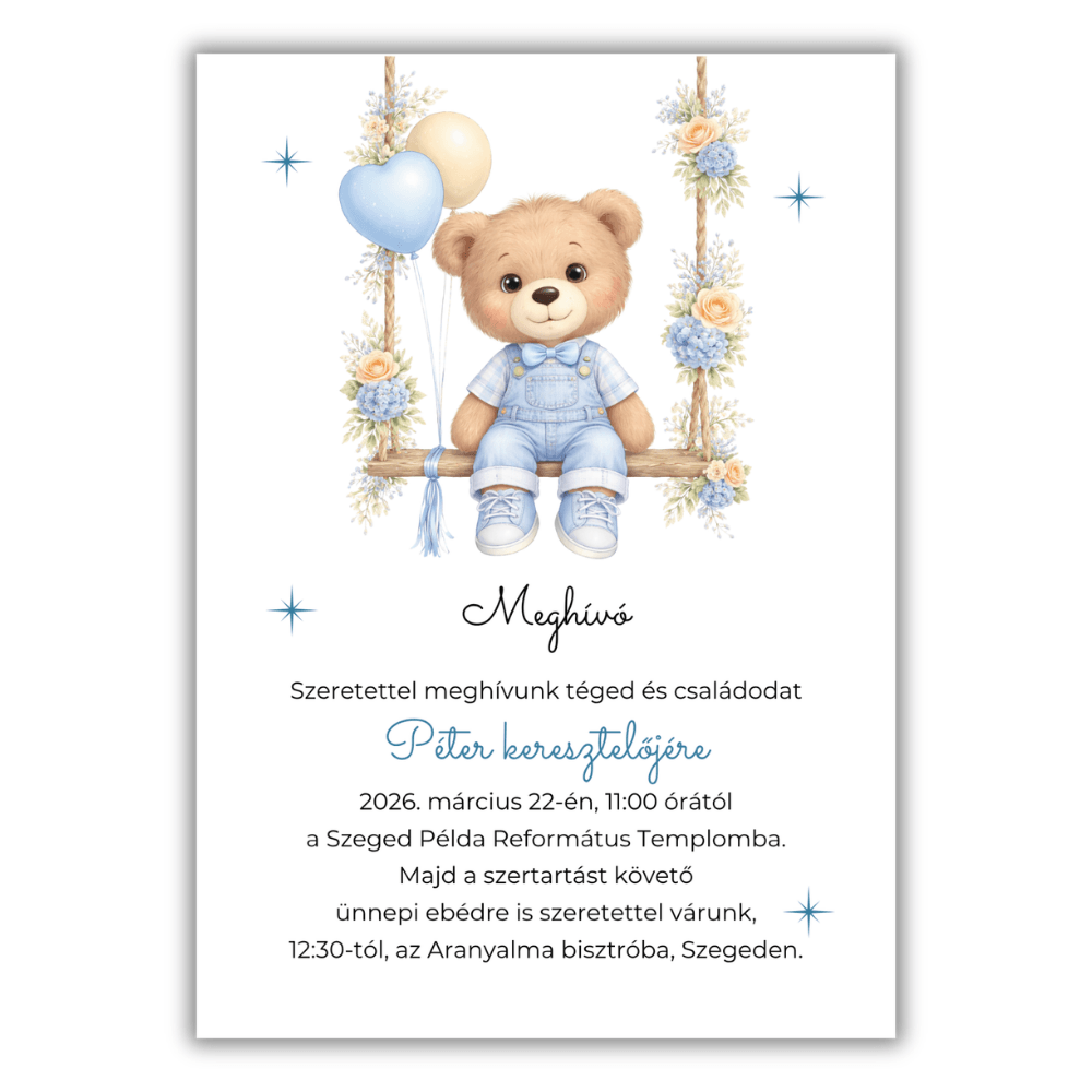 A kedves, kertészgatyás maci figurája és a körülötte tündöklő virágos hinta motívuma mesebeli, mégis rendkívül elegáns keretet adnak a meghívásnak. Ez a letisztult, prémium megjelenésű design tökéletes választás, ha egy igazán szívhez szóló és maradandó emléket szeretnétek adni a családtagoknak és barátoknak.