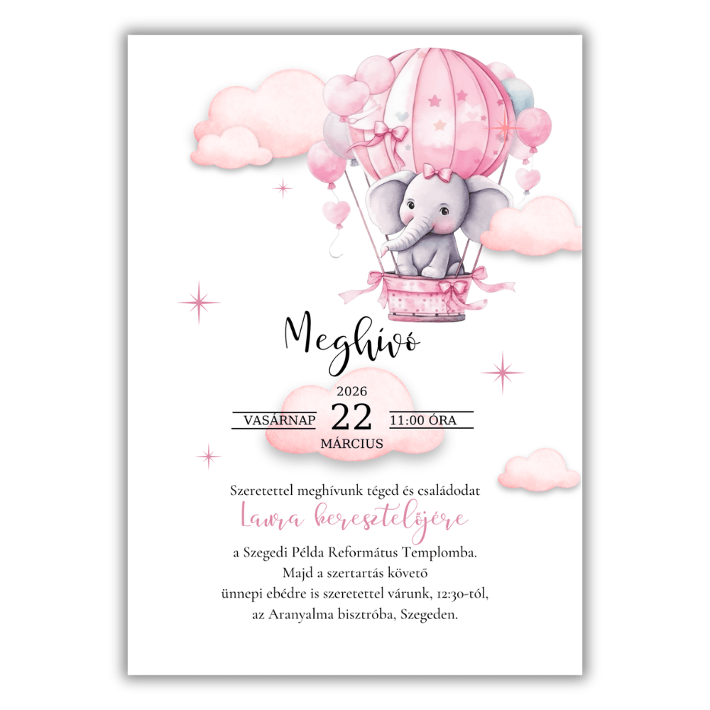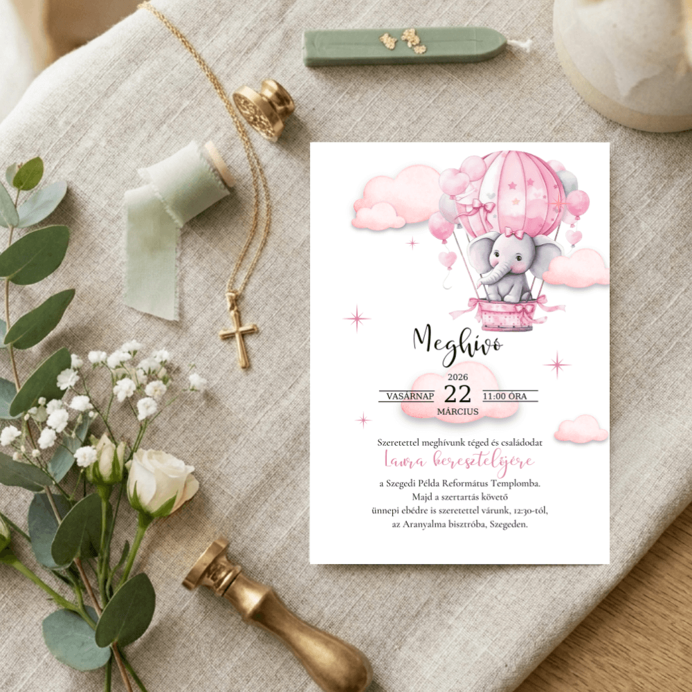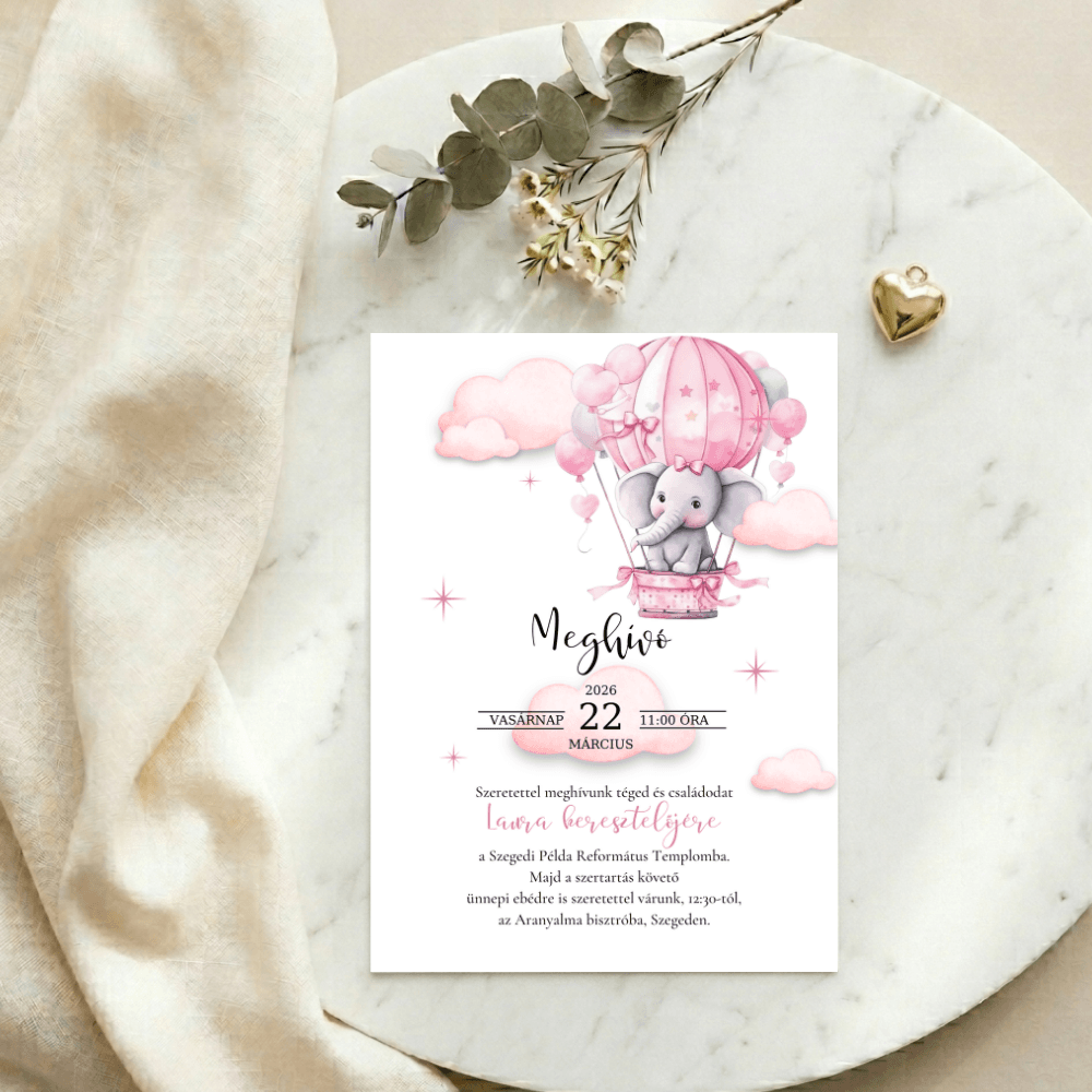 A kedves elefánt figurája és a körülötte tündöklő rózsaszín hőlégballonos motívumok mesebeli, mégis rendkívül elegáns keretet adnak a meghívásnak. Ez a letisztult, prémium megjelenésű design tökéletes választás, ha egy igazán szívhez szóló és maradandó emléket szeretnétek adni a családtagoknak és barátoknak.