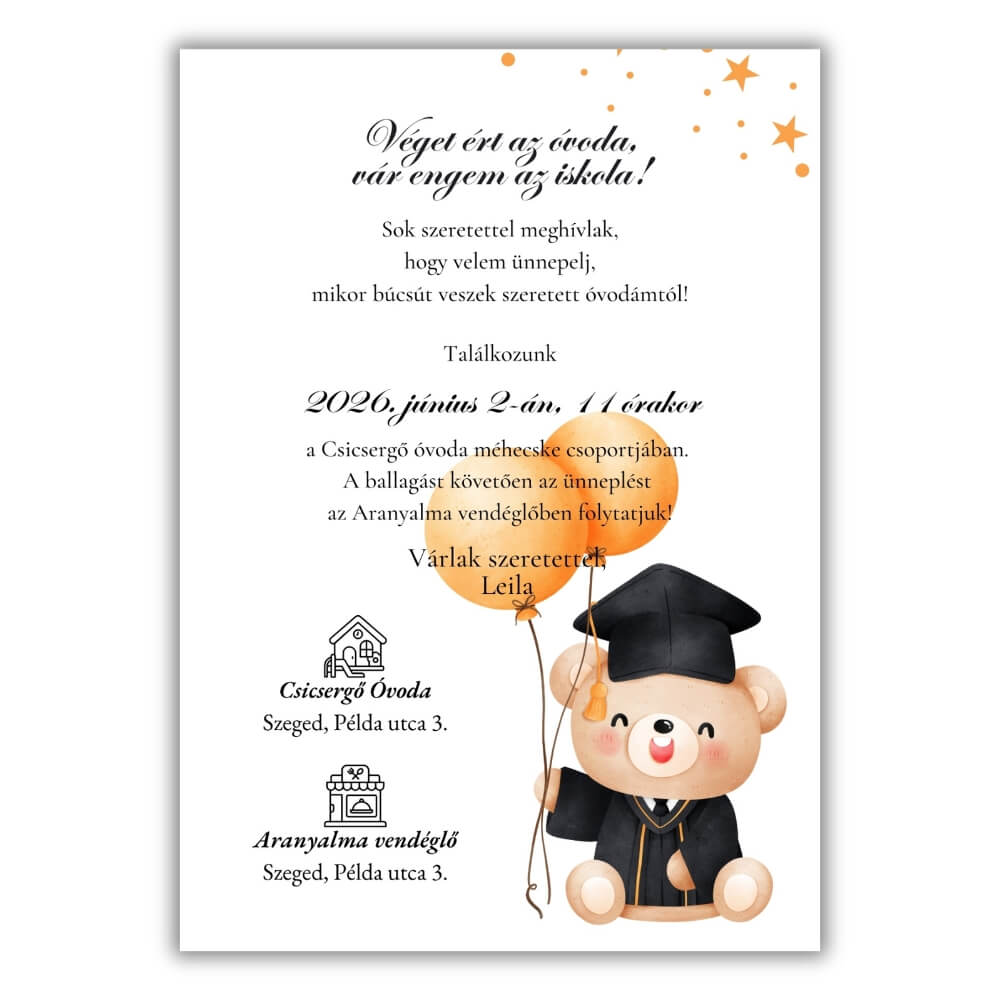 Ez a tündéri, ballagó ruhába öltözött, narancssárga lufit tartó macis meghívó a legkedvesebb választás az óvodai búcsúhoz. A Lauben Designnál tudjuk, hogy egy korszak lezárása érzelmes pillanat, ezért alkottuk meg ezt a barátságos, csillogó sárga csillagokkal díszített emléket.