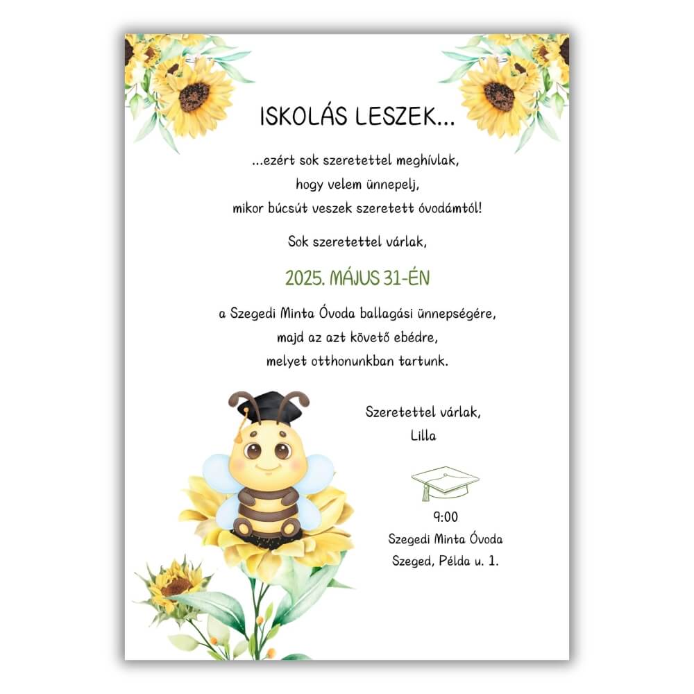 A Lauben Design hisz abban, hogy az óvodai ballagás az első nagy mérföldkő. Ez az egyoldalas, prémium minőségű kártya a napraforgók sárga ragyogásával és a méhecske barátságos karakterével garantáltan mosolyt csal minden meghívott arcára.