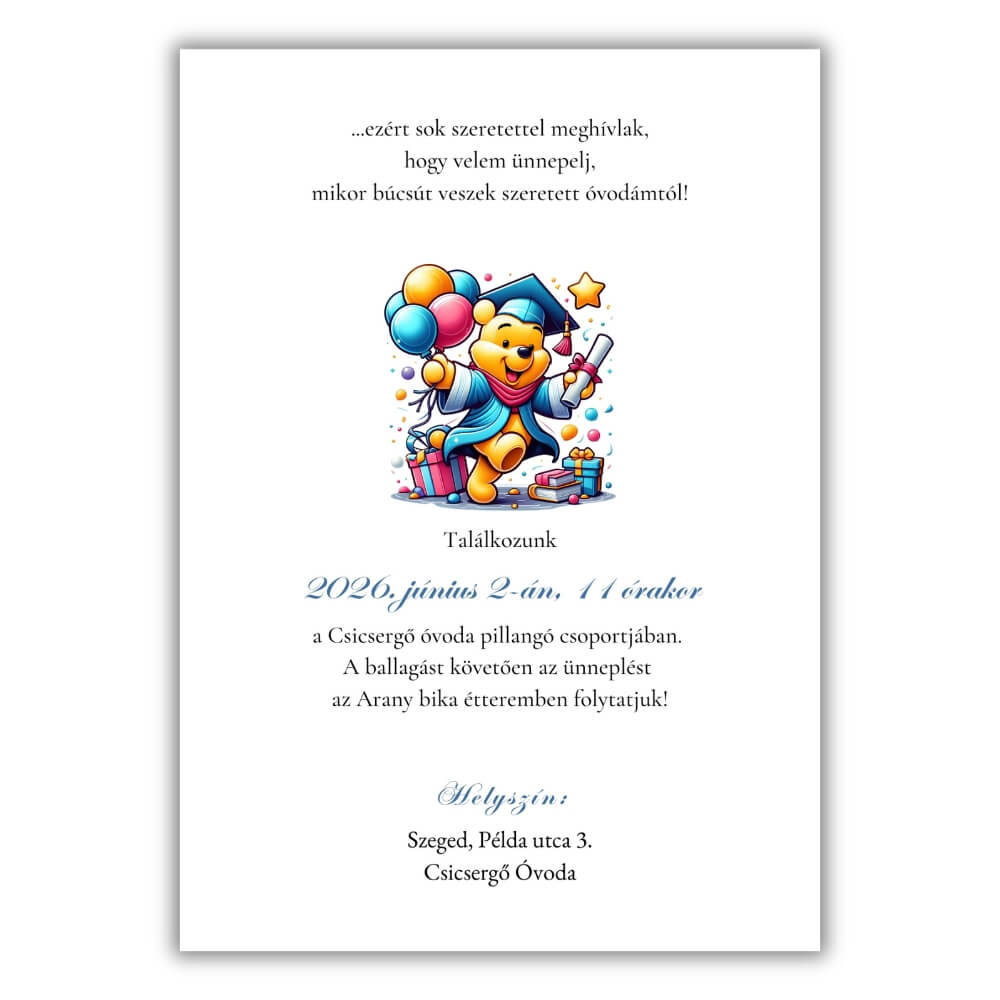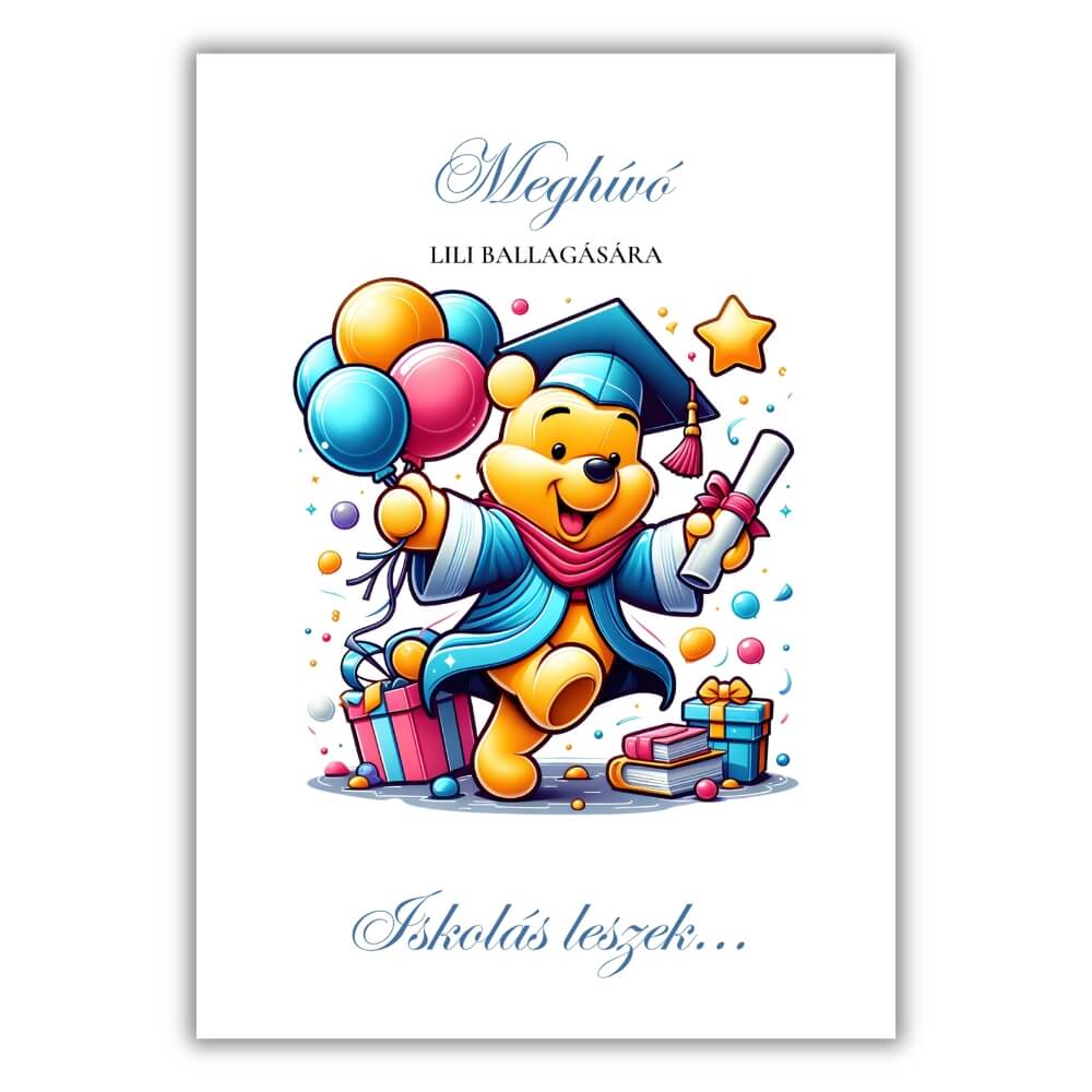 Színes, vidám, ballagási meghívó ünnepi ruhába öltözött Micimackóval, léggömbökkel és csillagokkal. A/6-os méretben, kétoldalas kivitelben, prémium kreatív papírra nyomtatva.