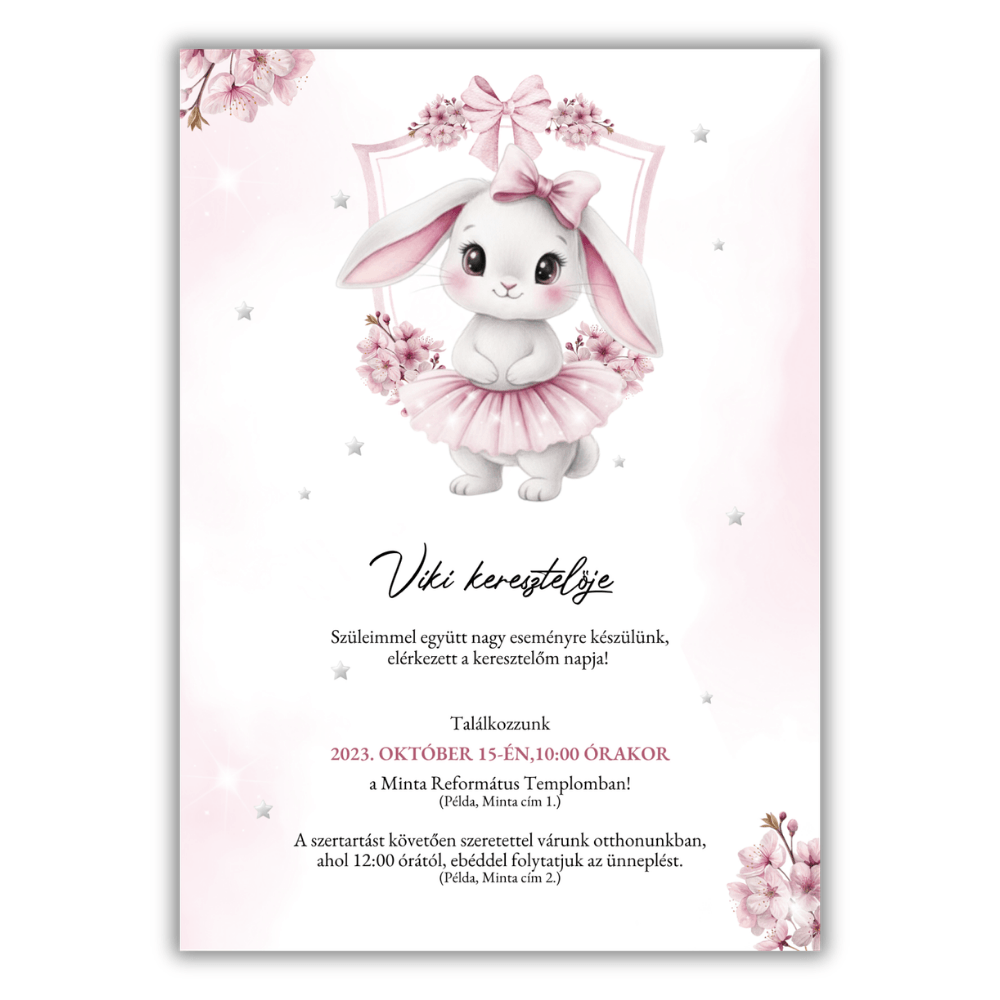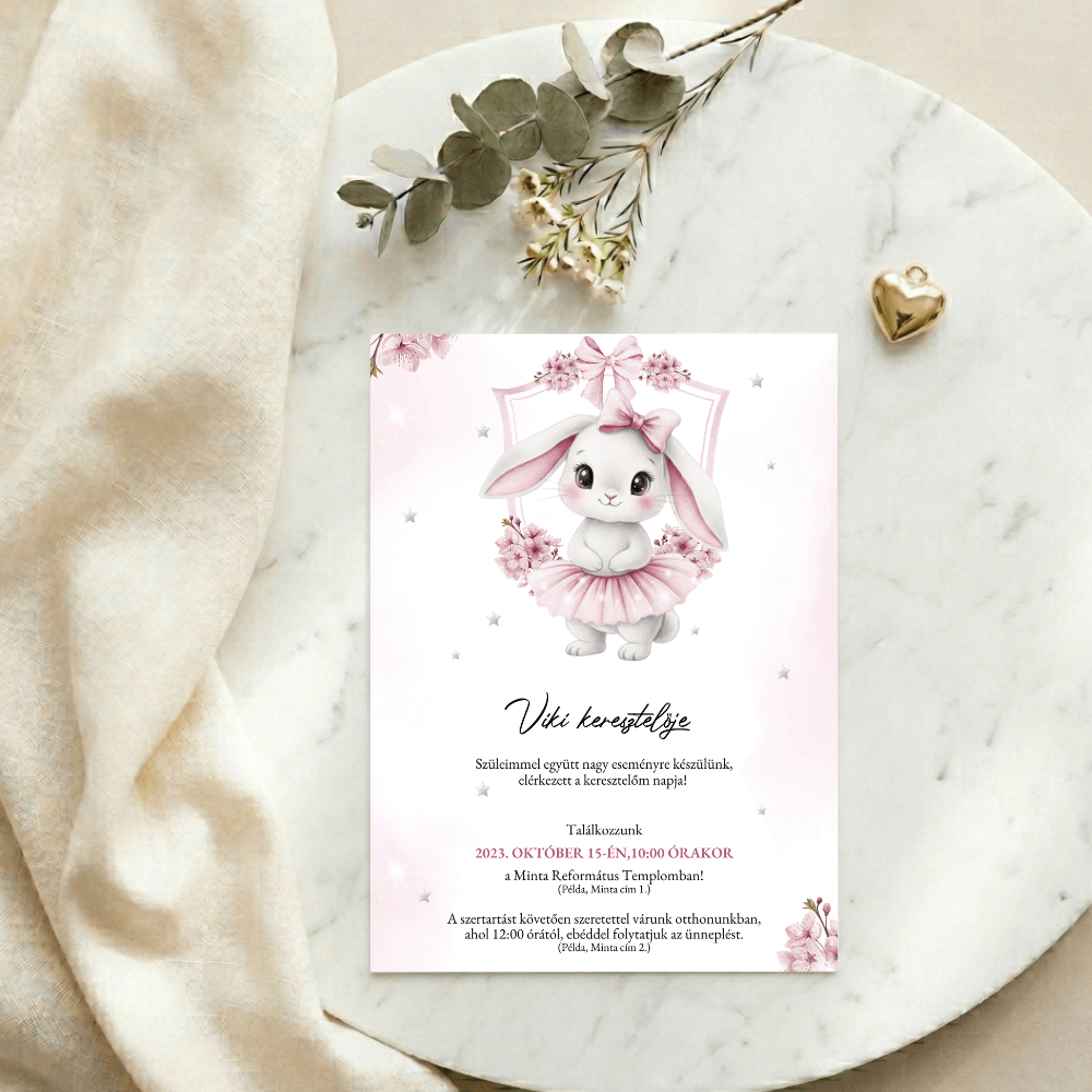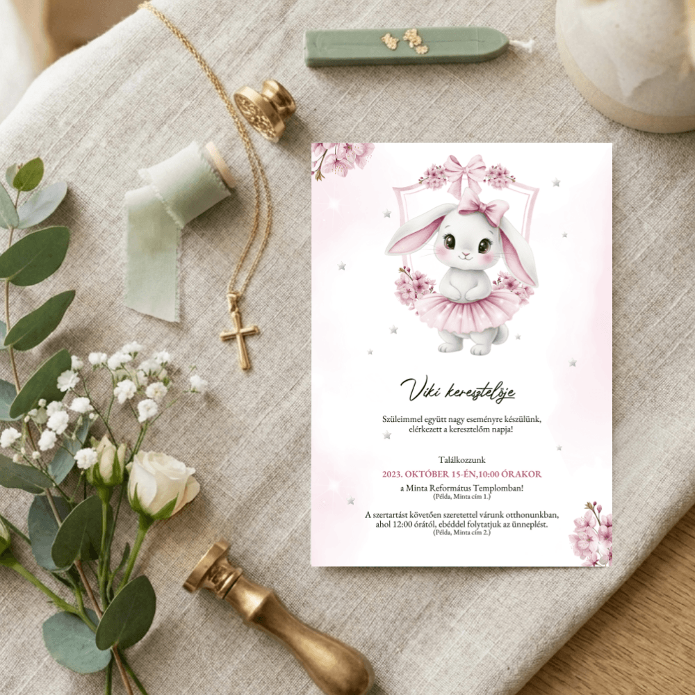 A tündéri nyuszilány figurája és a körülötte tündöklő virágos motívumok mesebeli, mégis rendkívül elegáns keretet adnak a meghívásnak. Ez a letisztult, prémium megjelenésű design tökéletes választás, ha egy igazán szívhez szóló és maradandó emléket szeretnétek adni a családtagoknak és barátoknak.