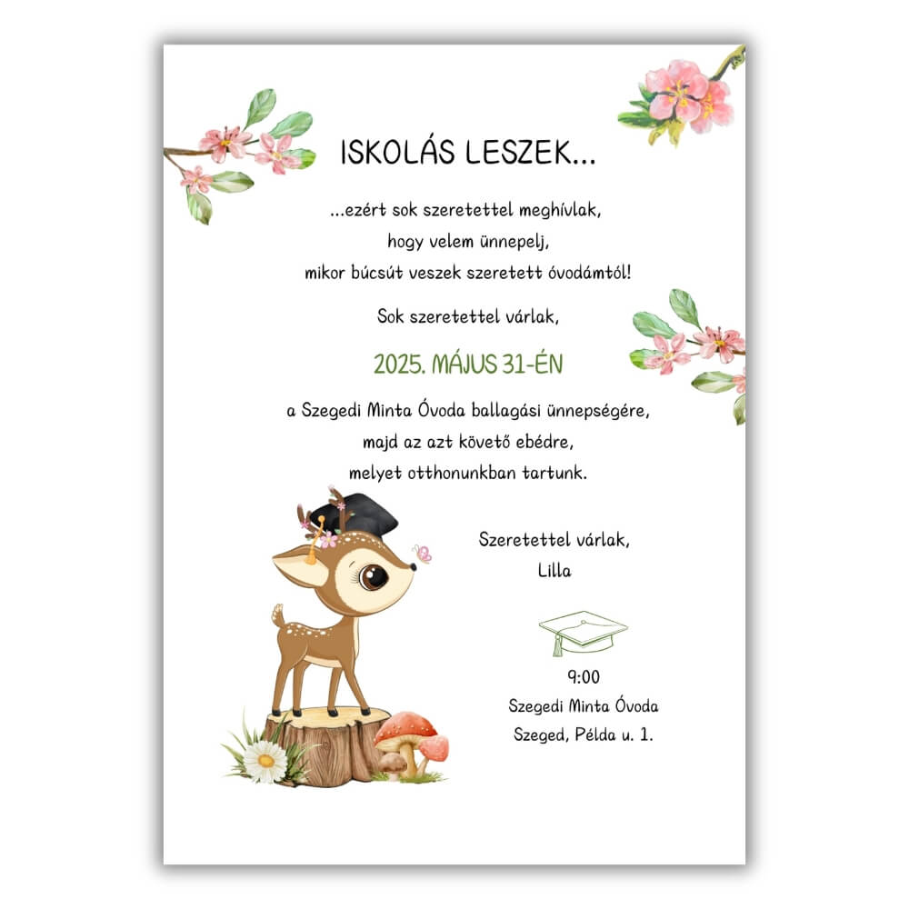 Lépjetek át az iskola kapuján az erdő legkedvesebb lakójával! Ez a diplomás őzikét, tavaszi virágokat és apró gombákat ábrázoló meghívó a természetes bájt és a növekedés örömét szimbolizálja. Tökéletes választás, ha egy olyan emléket szeretnétek, amely hűen tükrözi az óvodai évek békés, mesékkel teli és szeretetteljes világát.