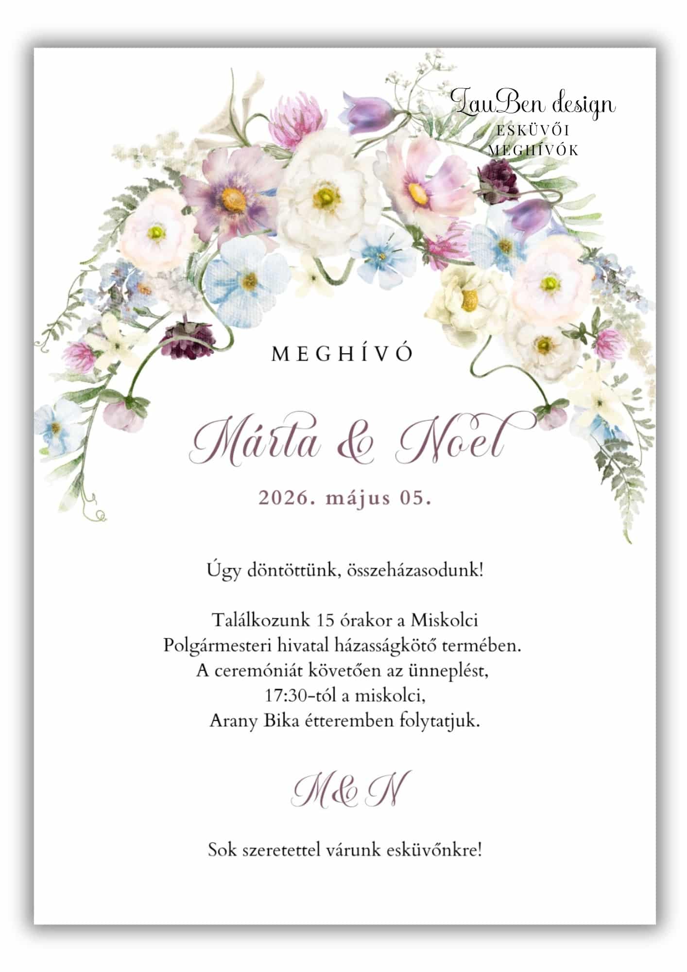 Pasztell Akvarell Vadvirágos Esküvői Meghívó (Romantikus Koszorú Design)