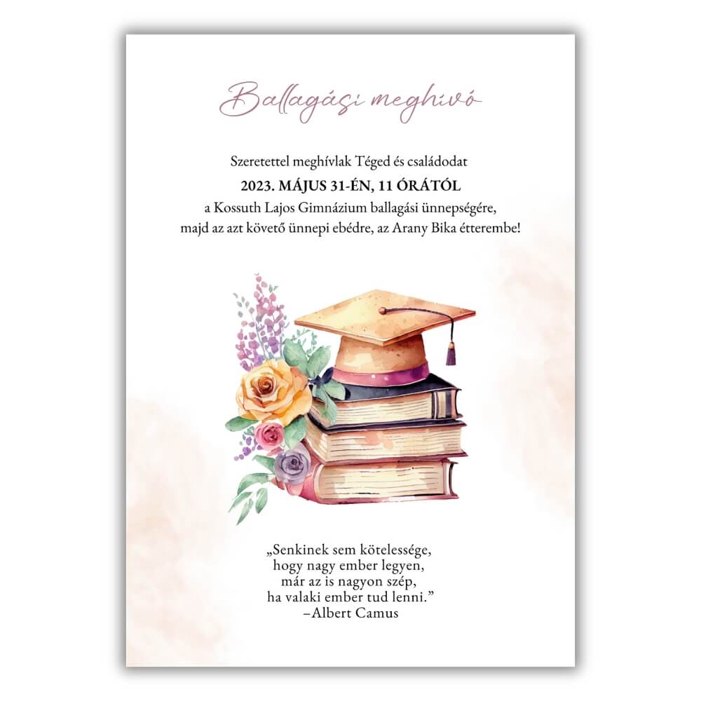- Grafika: Művészi pasztell virágok és klasszikus ballagási sapka motívum.