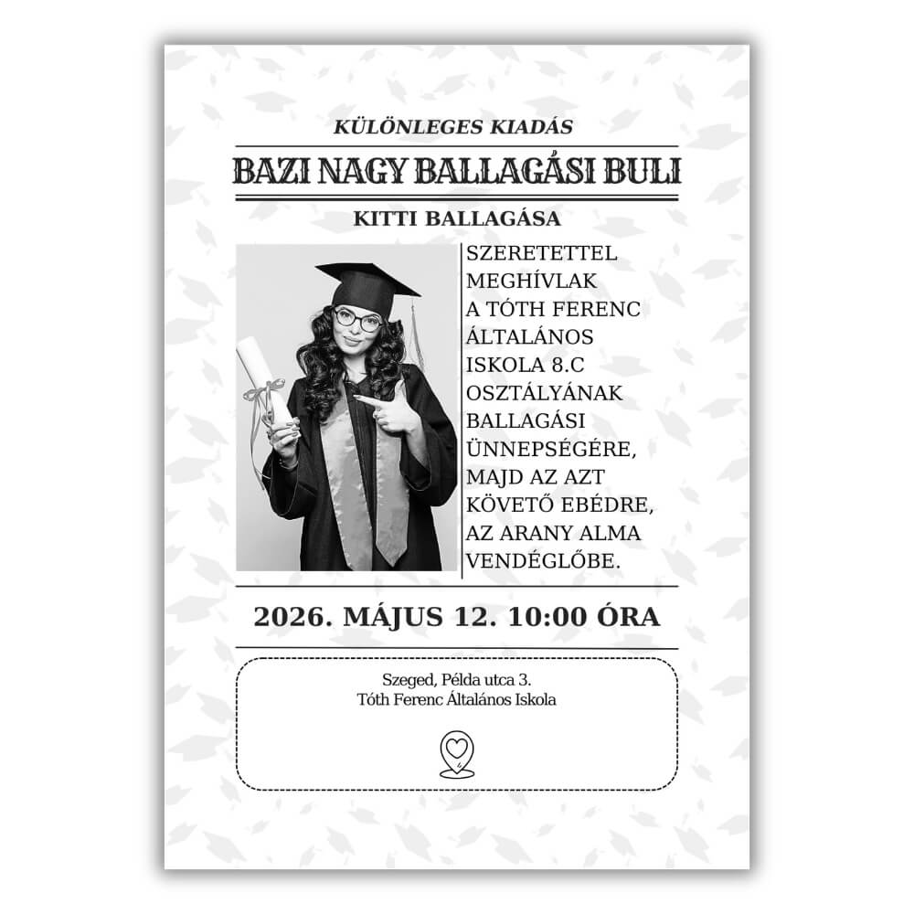 Kreatív, vicces ballagási meghívó újság címlap stílusban, egyedi fotóval. Modern, fekete-fehér dizájn, A/6-os méretben, prémium minőségben. Legyen a te ballagásod a nap híre!