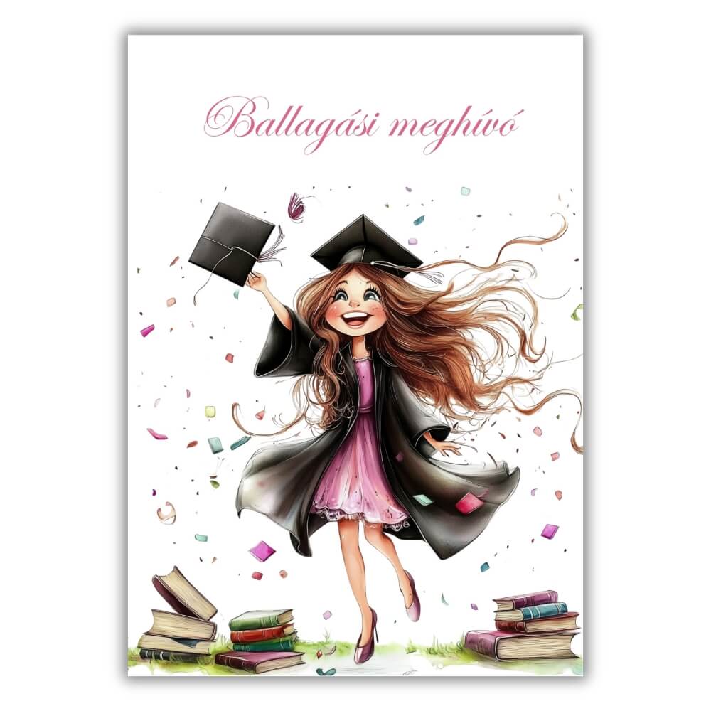 Virágos ballagási meghívó – Sipkát dobó kislány figurával
