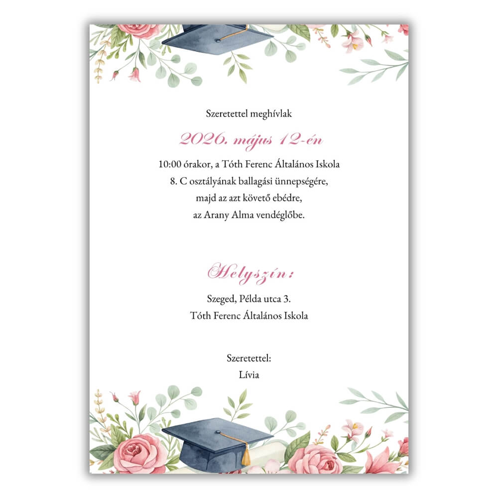 Ünnepeljétek stílusosan a nagy mérföldkövet ezzel a művészi, virágos motívumokkal díszített meghívóval! A diplomás sipkáját dobó, vidám kislány figurája mindenkit mosolyra fakaszt, miközben hirdeti: egy újabb fejezet kezdődik.