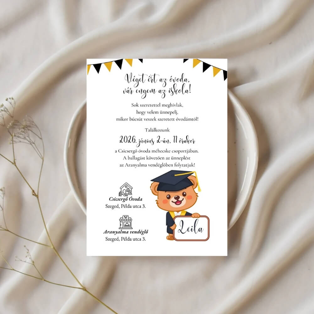 Ez a modern stílusú, sárga-fekete zászlófüzérrel és ballagó sapkás kismacival díszített meghívó az igazi ünnepi hangulat hírnöke. A Lauben Designnál a letisztult formákat és a kedves karaktereket ötvöztük, hogy ez a különleges nap örökre emlékezetes maradjon a család számára.